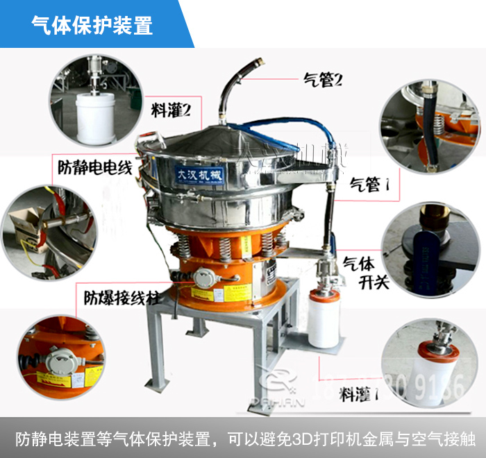 3D打印機(jī)金屬粉與空氣接觸易發(fā)生爆炸,在選擇振動篩時(shí)這是用戶擔(dān)憂的一個(gè)問題,所以對于振動篩選型來說是需要極其謹(jǐn)慎的。氣體保護(hù)振動篩機(jī)是針對某些物料的特性加裝的,比如有些物料不能接觸氧氣,二氧化碳等等,采用氣體保護(hù)軟管,防靜電裝置等氣體保護(hù)裝置,可以避免3D打印機(jī)金屬與空氣接觸。