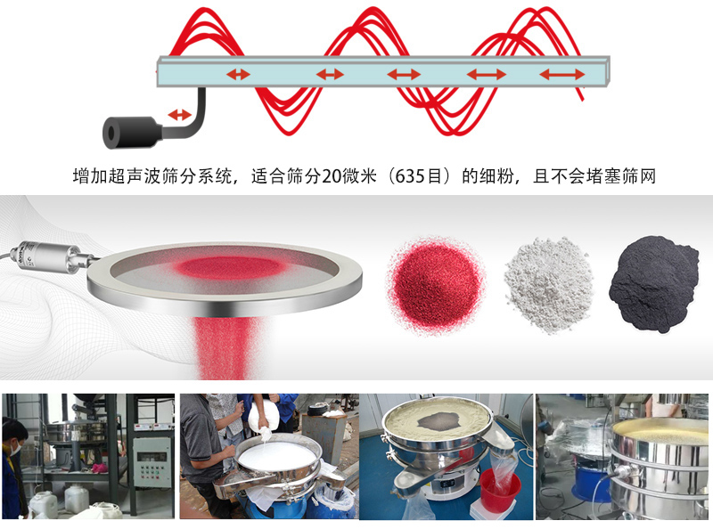 超聲波振動篩可應用于400目、500目、600目篩分碳化硅、合金粉末、鉬粉、不銹鋼粉、鎢粉、鎳粉、鈷粉、粉末涂料、石英粉、丁米酮粉、麥芽粉、病毒唑、咖啡粉、電磁粉、負極材料、激光粉。